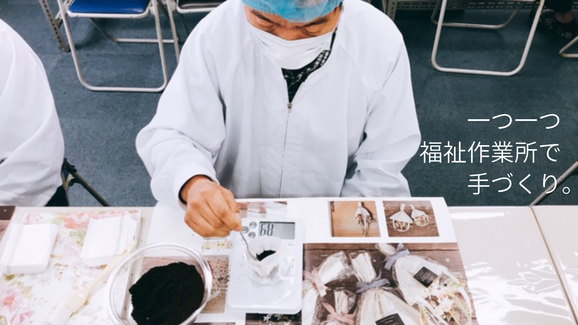 「∞Café(ハチカフェ)」は、コーヒー豆を袋詰めし、製品化する作業を就労継続支援B型事業所「みどり工房」「すみれ工房」に委託しています。
