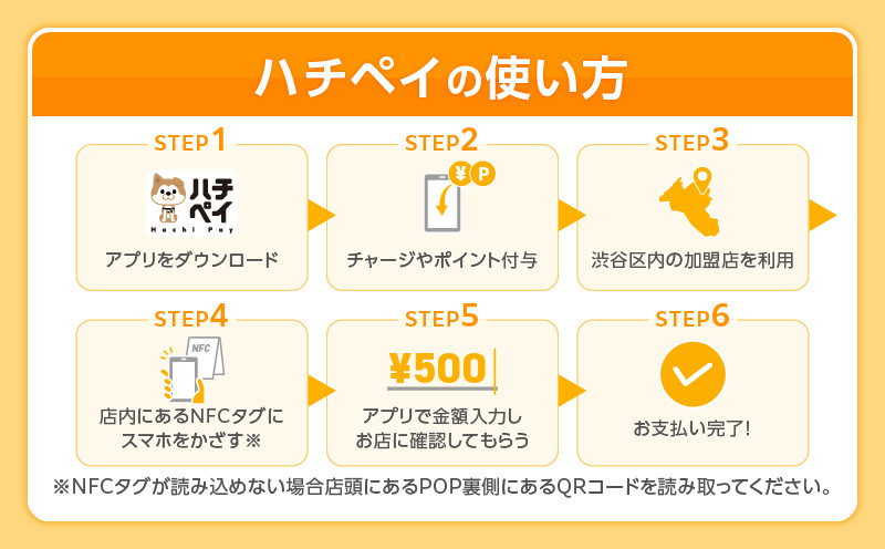 渋谷区内限定で、店舗やコミュニティ、イベントで利用ができる決済型スマートフォンアプリ(キャッシュレス決済アプリ)「ハチペイ」。