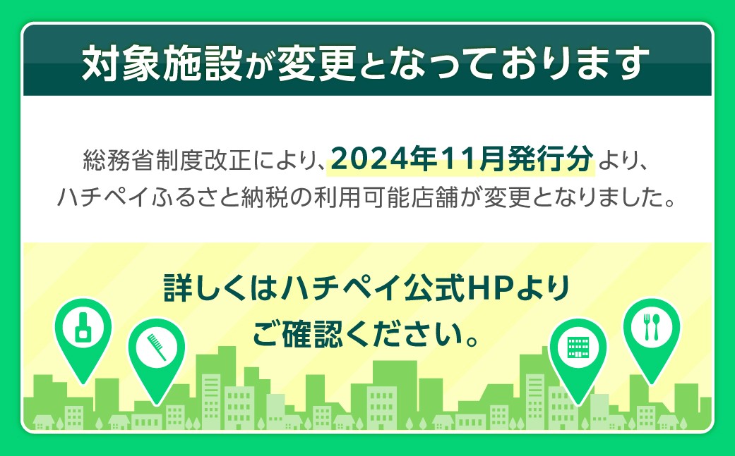 ※2024年12月より、利用可能な店舗を以下のとおり変更いたします。変更前に「ハチペイ」ふるさと納税ポイントを受け取られた方も含め、すべての人に本変更は適用されますのでご注意ください。