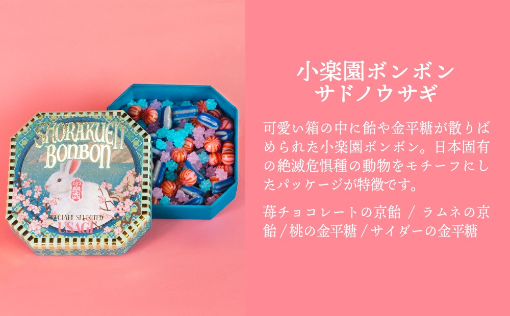 色とりどりの京飴と金平糖がたくさん詰まったとっておきの一箱。日本固有の絶滅危惧種の動物をモチーフにパッケージにしています。