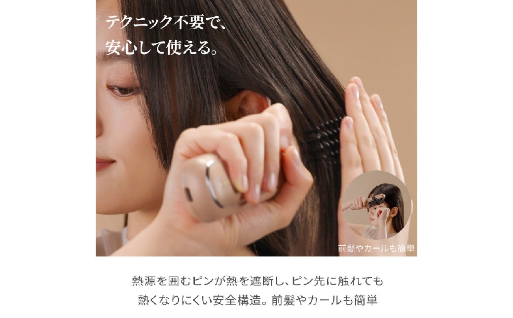 ピンの内側に熱プレートが付いており、髪全体に熱が伝わるのに高温になりすぎず、髪をとかすだけで、ナチュラルなヘアスタイルが作れます。