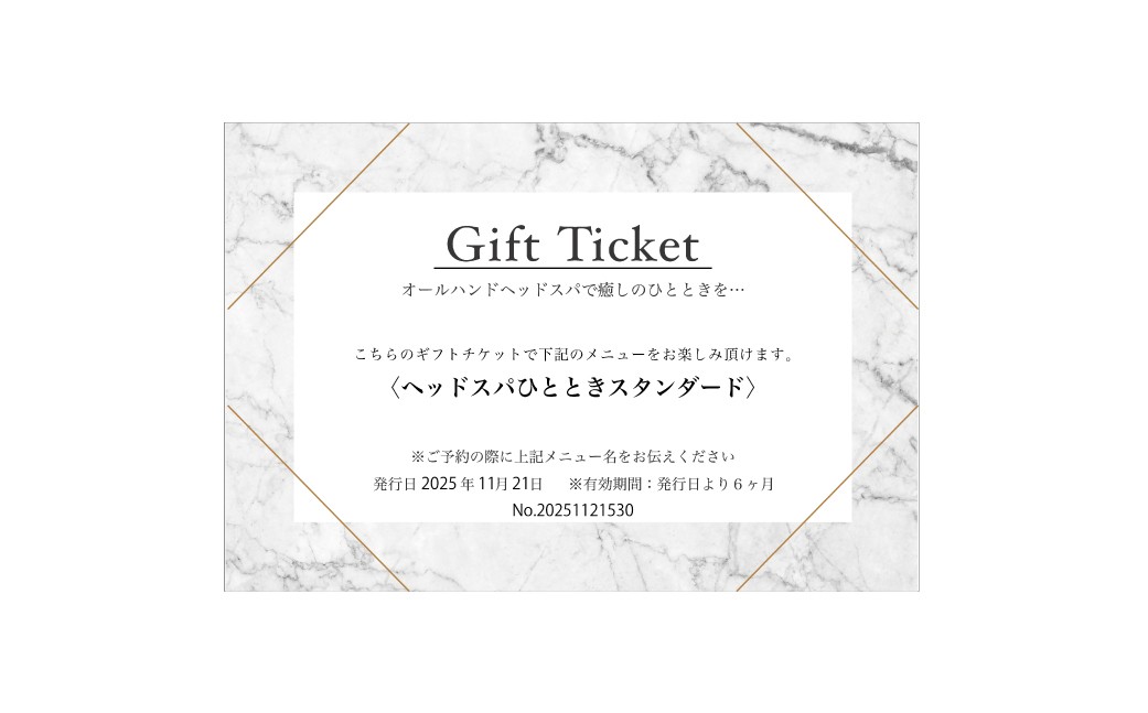 | 容量 | 「ヘッドスパ専門店ひとときのしずく」にて使用できる利用チケット ヘッドスパひとときスタンダードコース 1名様分 |