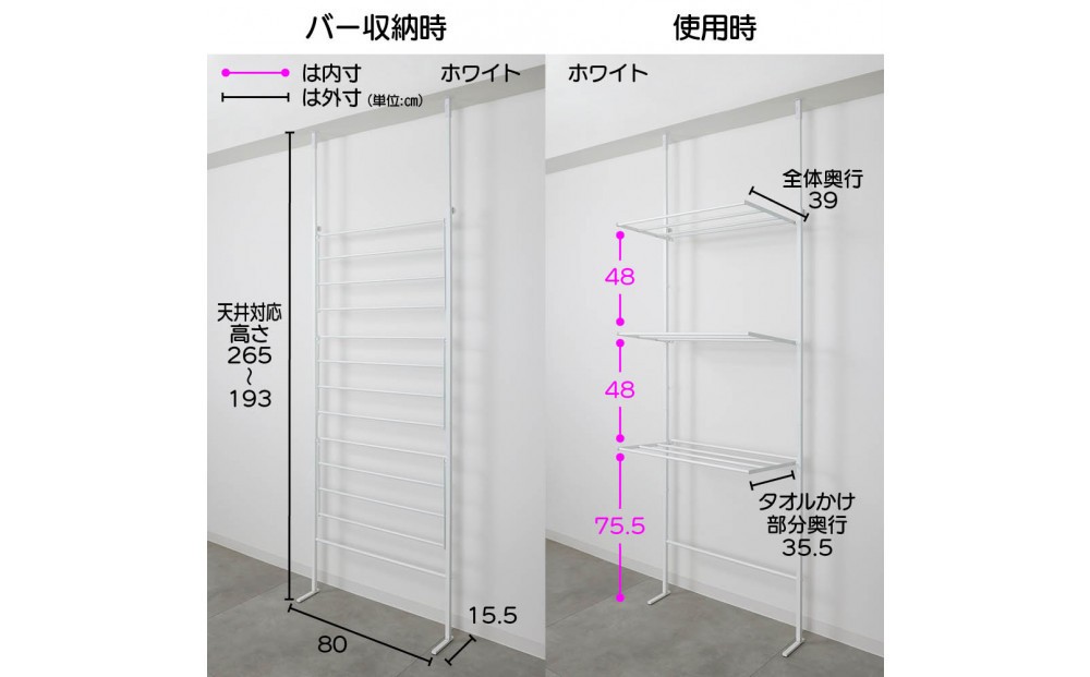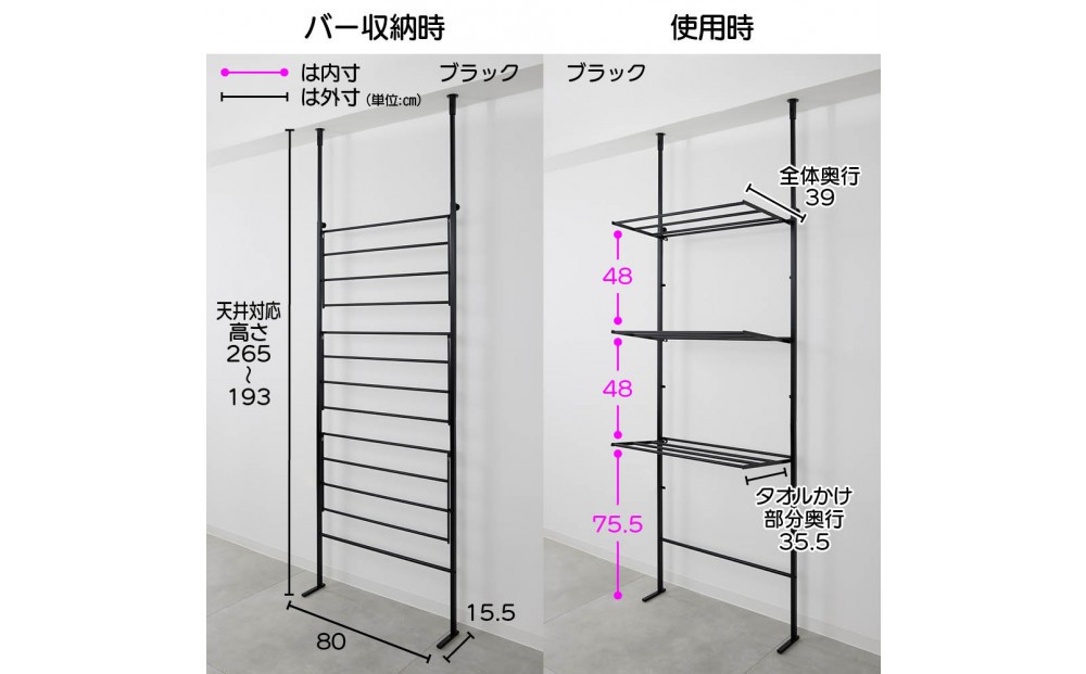 | 容量 | ■色:下記2色よりお選びください ホワイト/ブラック ■サイズ 【物干し】幅80奥行39対応天井高さ193~265cm 収納時奥行15.5cm【棚板】(1枚): 幅34×奥行26.5×高さ1.7cm・重さ0.55kg ■素材 物干し本体・棚板:スチール(メラミン焼付塗装) ハンガー:スチール(カチオン下地メラミン焼付塗装) ■耐荷重1段あたり約2kg ■日本製 |