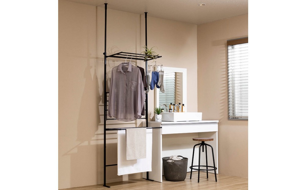 何も置いていなかった壁際がオシャレな物干しスペースに大変身。使わない時はバーユニットを畳むことができるので、空いたスペースを有効にお使いいただけます。