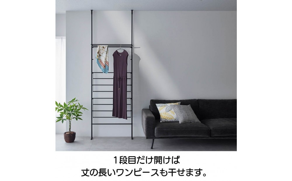 1段目のバーだけを開けば十分な高さがあるので、マキシワンピースやパンツなど、丈の長い衣類をハンガーに掛けて干すことができます。