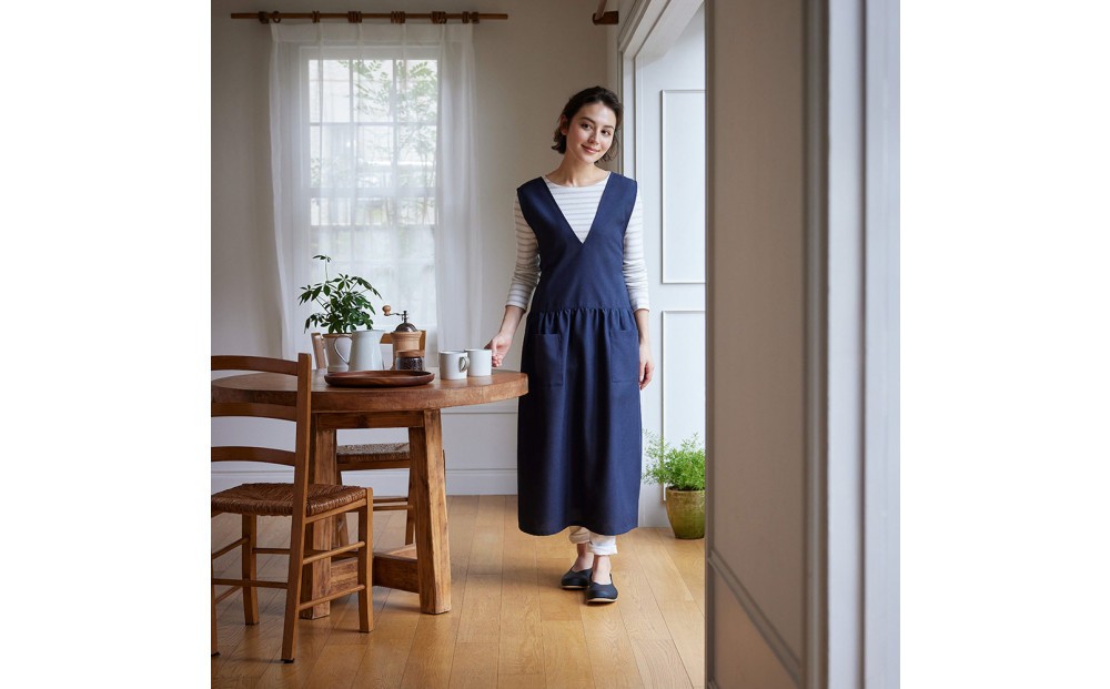 時短のため、家事の時にエプロンを使わないという暮らしコーディネーターの瀧本さん。もし自分が着るなら、着たまま外出できて、シワになりにくく洗濯も簡単なもの。そんな瀧本さんの理想を詰め込みで作った、誰でも気楽におしゃれに着られる1着です。まるでジャンパースカート。大人心をくすぐるシックな2WAY。ウエストで切り替えてギャザーをたっぷり寄せることで、動きやすさと女性らしさを両立。胸元が出すぎないVネックと、やさしい印象のUネックのリバーシブル仕様。普段着として愛用したくなるほど、おしゃれでかわいいデザインですいつもの服の上からストンとかぶるだけ