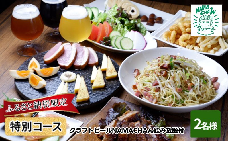 | 容量 | 2名様コース料理。 前菜盛合わせ、グリーンサラダ、スモークスナック、フライドポテト、熟成燻製チーズ、人気の燻製盛り合わせ、お肉料理、燻製醤油の焼きそば、デザート、NAMACHAんビール飲み放題+その他ドリンク飲み放題(ウイスキー、焼酎、カクテル、ワイン、ノンアルコール) ※メニュー内容は季節や仕入れ状況により変更する場合がございます。 |