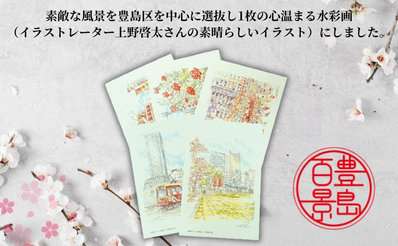 また素敵な風景を豊島区を中心に選抜し6枚の心温まる水彩画(イラストレーター上野啓太さんの素晴らしいイラスト)のはがきをセットいたします。