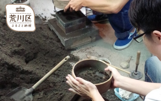 自身の手によって砂の鋳型から純錫製品を手作りできる本格的な鋳金体験です。