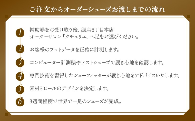 | 容量 | 銀座かねまつのオーダーシューズご購入時に充当できる補助券(3,000円分) ●補助額は寄附金の3割相当です。 【お申し込み後の流れ】 お申し込み後、補助券を送付させていただきます。 お受け取り後、銀座6丁目本店 オーダーサロン「クチュリエ」へご来店いただき、オーダーシューズの作成を進めさせていただきます。 ※ご来店の際には、事前に銀座かねまつHP「クチュリエ来店予約」からご予約いただけますと、スムーズにご案内できます。 ※ご注文は「銀座6丁目本店」でお受けいたしますが、制作・検品は荒川区で行っております。 ※オーダーシューズは、ご来店から3週間程度で完成いたします。 |
