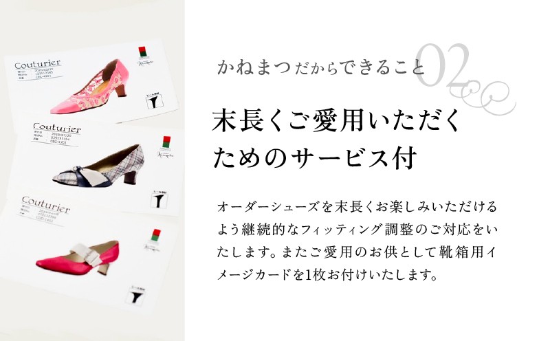 また、最上の履き心地をいつまでもお楽しみいただけるよう、お買い上げ後もフィッティングを承っておりますので、お気軽にスタッフまでお申し付けください。