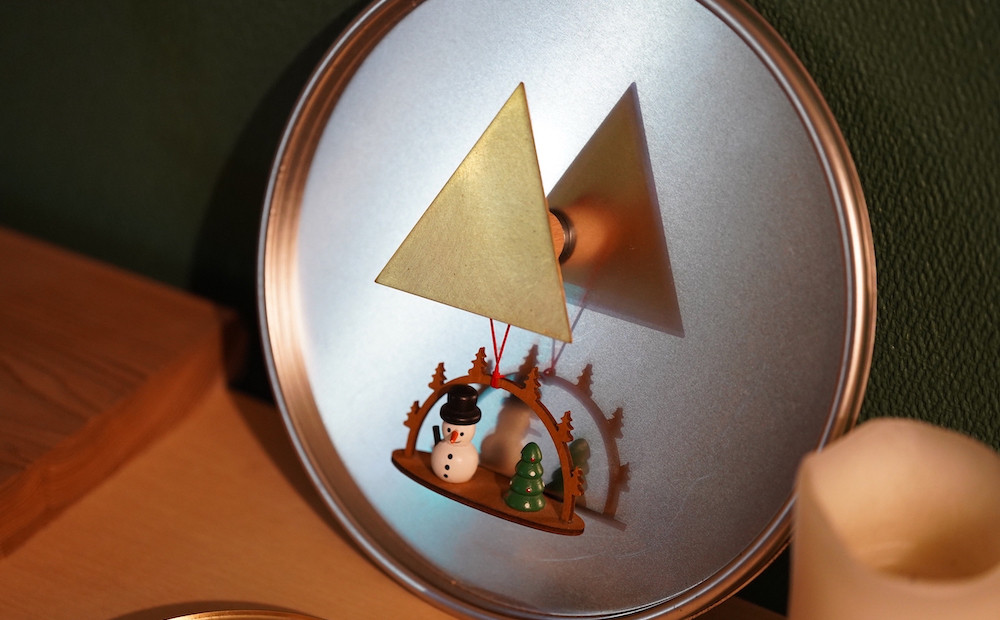 大きさ・形の異なる三角の真鍮板にオーナメントをぶら下げてツリーをつくります。