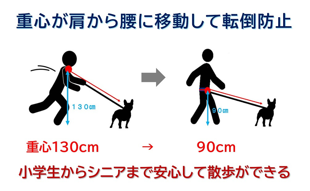 ・普通のリードでは肩が引っ張られますがハンズフリーベルトは腰が引っ張られるので重心が地上130㎝から90㎝に下がります。(身長170㎝の場合)