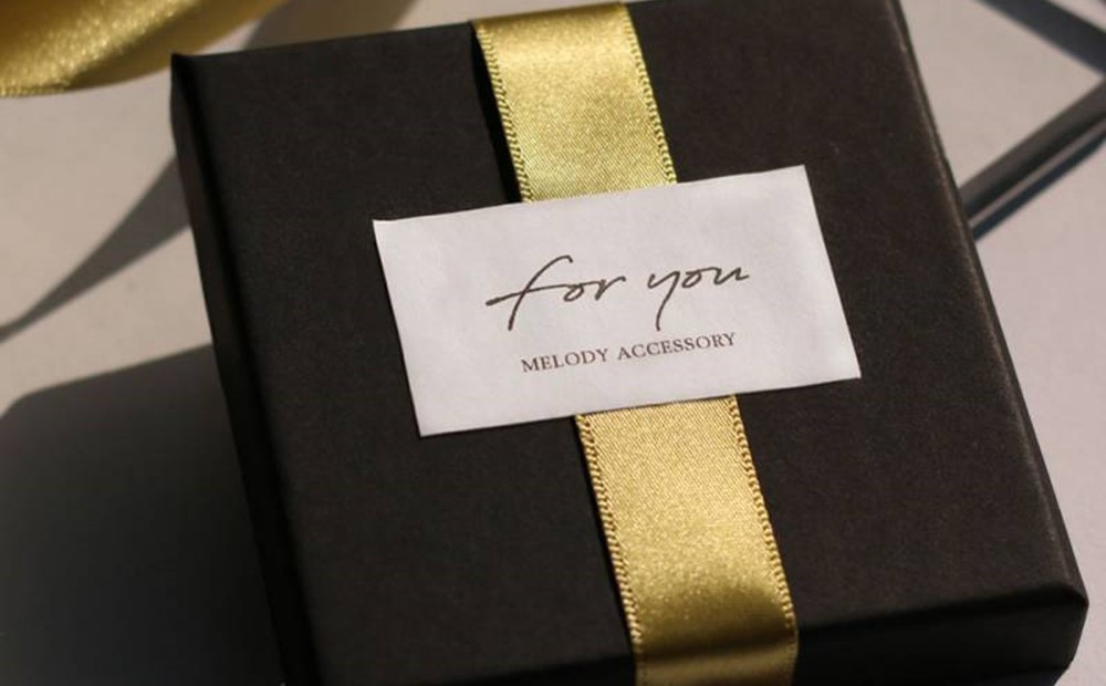 ブラックのかっちりとしたプレゼントボックスにゴールドのリボンをかけ、