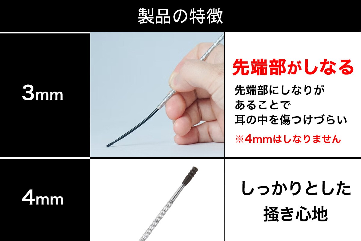 先端部の太さは4mmと3mmの2タイプ。