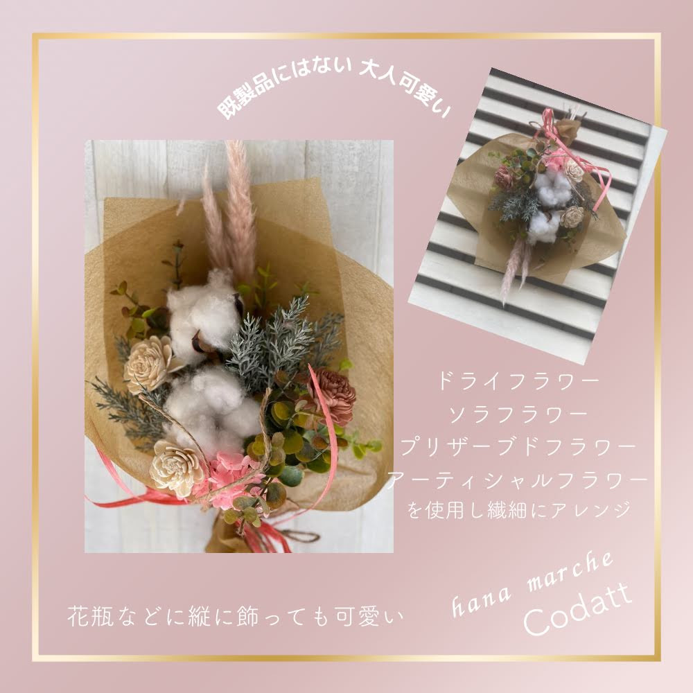 ★配達日指定可能です★ ナチュラル ドライフラワー スワッグ ピンクテールのドライフラワー+プリザーブドフラワーのアジサイ+アーティシャルグリーンで束ねた花束です。 コンセプトは上品で愛らしく。 ご自宅の癒しスペースに。 壁にかけて長期に飾っていただけます。 花瓶やカゴにおいて飾っていただいても可愛さ倍増です。 フワモコで優しい彩のグリーンで笑顔の花が咲きますようにとの想いでお送りいたします。 【注意事項】 ※自然の素材を使っているため質感や色味が写真の印象と異なる場合がございます。 ※生花なので多少の個体差があります。 ※お申し込み時に入力いただいた申請者情報及び寄附情報については、お礼の品の送付等を行うため事業者(花マルシェコダット)および配送業者に提供し、必要に応じて事業者からご連絡をする場合などがありますので、ご了承ください。 ■提供事業者:花マルシェコダット 店舗:東京都足立区青井3-34-10