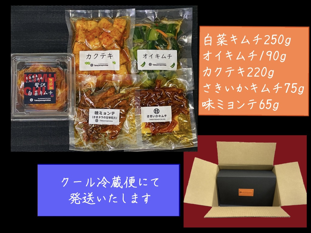 | 容量 | 白菜キムチ 250g オイキムチ 190g カクテキ 220g さきいかキムチ 75g 味ミョンテ(さきタラの甘辛和え) 65g |