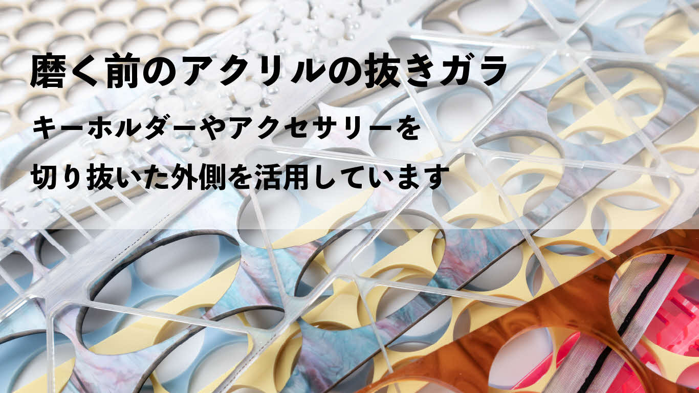 「Refine Acrylic」は、そのTOKYO ACRYLをキーホルダーやアクセサリーなどに加工をする際に生じる「抜きガラ」を磨き、加工でカドを滑らかに使いやすくアップサイクルしたアイテムです。