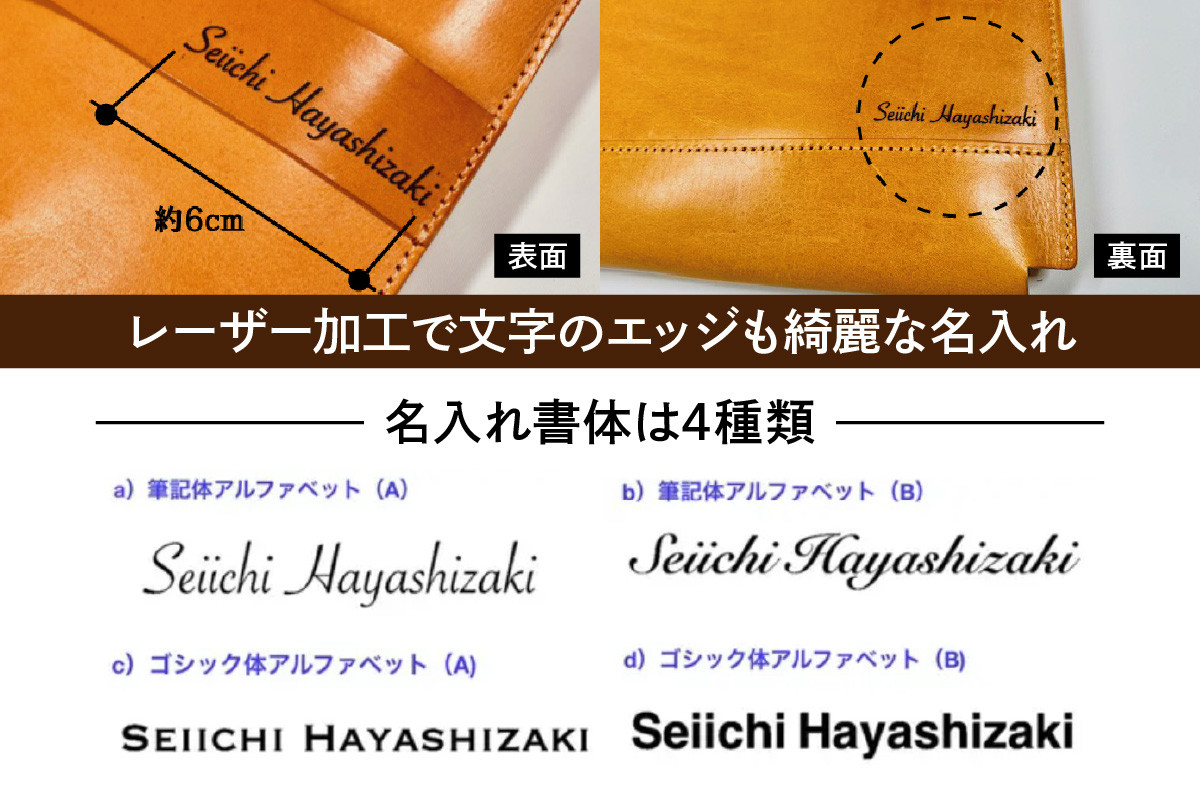 本体スマホポーチの表面裏面に、4種類の書体からそれぞれ約20文字合計40文字のお好きな言葉やお名前をレーザー加工にて名入れを行い、お届けいたします。