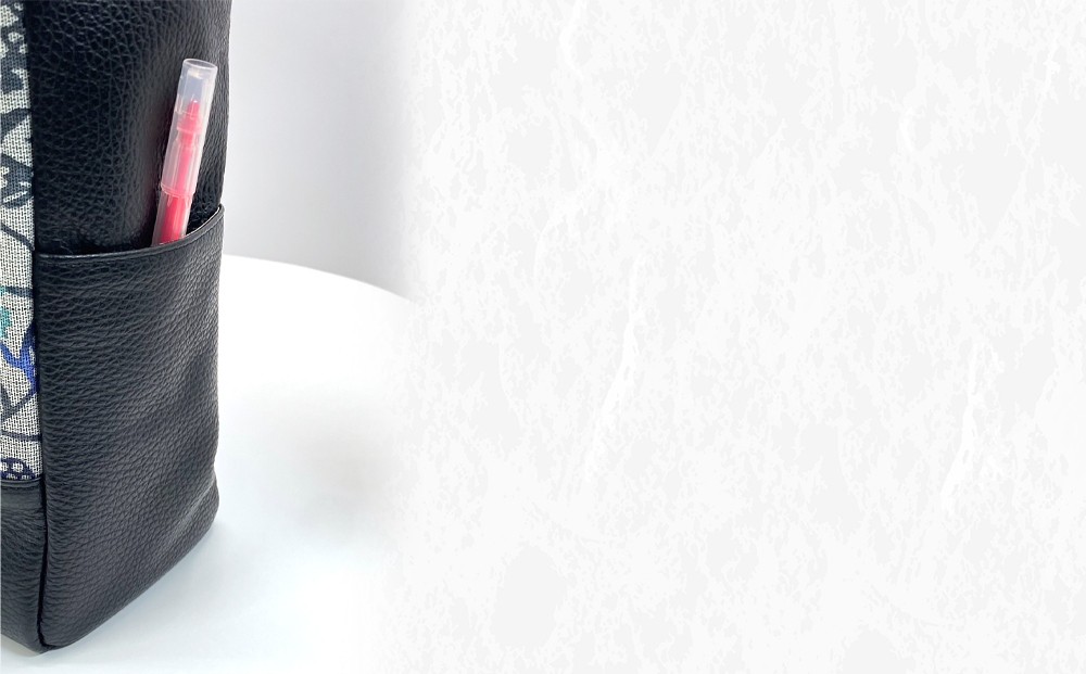 手挿し江戸紅型染めを施した紬生地と軽くてやわらかい牛革を合わせました。