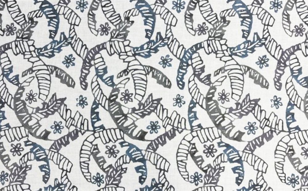 更紗調の柄と藍系配色の手挿し江戸紅型染着尺