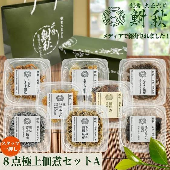 佃煮専門店の秘伝のたれと職人の手が織りなす一品を「食卓」に、「贈り物」に。 鮒秋 佃煮 8個詰め合わせ Aセット 《 鰻佃煮 (大) あさり佃煮 極上いかあられ ほたるいか佃煮 ちりめん山椒昆布 くるみしらす佃煮 細切汐吹昆布 たらこ昆布 》|TVで紹介されました 大正6年創業 老舗佃煮専門店 鮒秋の秘伝のたれで旨みを閉じ込め炊き上げた佃煮 ご飯のお供 おにぎり お茶漬け おつまみ 佃煮セット ギフト 贈答 父の日 母の日 敬老の日 お返し 内祝い [1264]