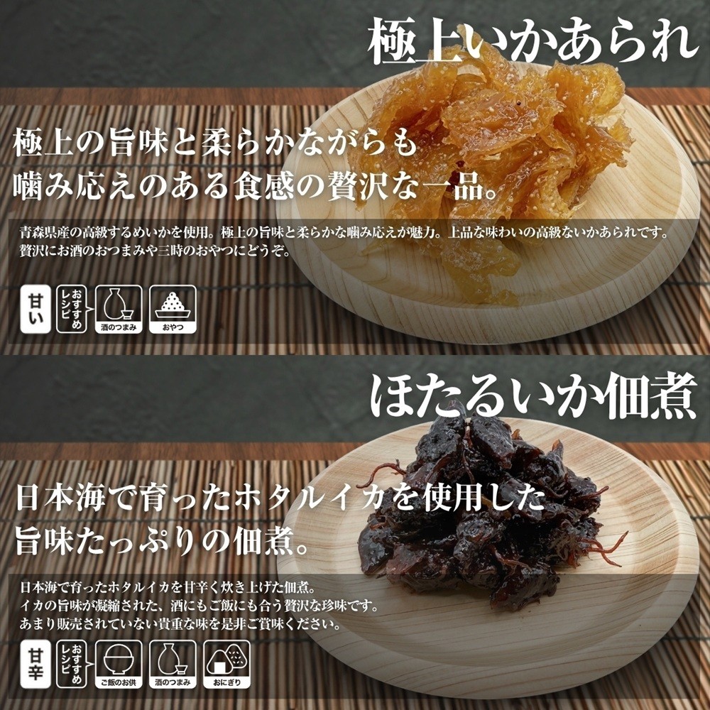 | 容量 | ■セット内容:鰻佃煮 (大)、あさり佃煮、極上いかあられ、ほたるいか佃煮、ちりめん山椒昆布、くるみしらす佃煮、細切汐吹昆布、たらこ昆布 《鰻佃煮 (大)》 ■内容量:100g ■原材料:鰻、醤油、砂糖、みりん、生姜 ■主な原材料の産地:鰻 (静岡県浜名湖または鹿児島県) 《あさり佃煮》 ■内容量:50g ■原材料:あさり、醤油、砂糖、みりん、生姜 ■主な原材料の産地:あさり (中国)、生姜 (国産) 《極上いかあられ》 ■内容量:50g ■原材料:いか、醤油、砂糖、水飴、塩、寒天、けしの実、調味料、保存料 ■主な原材料の産地:いか (青森) 《ほたるいか佃煮》 ■内容量:50g ■原材料:ほたるいか、醤油、砂糖、水飴、みりん、米酢、唐辛子、寒天 ■主な原材料の産地:ほたるいか (国産) 《ちりめん山椒昆布》 ■内容量:40g ■原材料:しらす、山椒の実、昆布、醤油、砂糖、みりん、清酒、調味料 ■主な原材料の産地:しらす (国産)、昆布 (北海道) 《くるみしらす佃煮》 ■内容量:50g ■原材料:くるみ、醤油、砂糖、みりん、水飴、塩、白ごま、米酢、寒天、しらす (ぎんぽ) ■主な原材料の産地:くるみ (アメリカ)、しらす (中国) 《細切汐吹昆布》 ■内容量:30g ■原材料:昆布、醤油、塩、砂糖、調味料、酸味料 ■主な原材料の産地:昆布 (北海道) 《たらこ昆布》 ■内容量:50g ■原材料:昆布、たらこ、醤油、砂糖、水飴、酢、ぶどう糖、みりん、調味料、保存料、着色料 ■主な原材料の産地:昆布 (北海道)、たらこ (北海道) |
