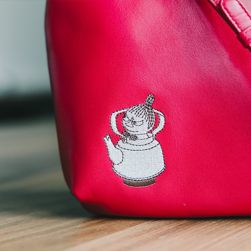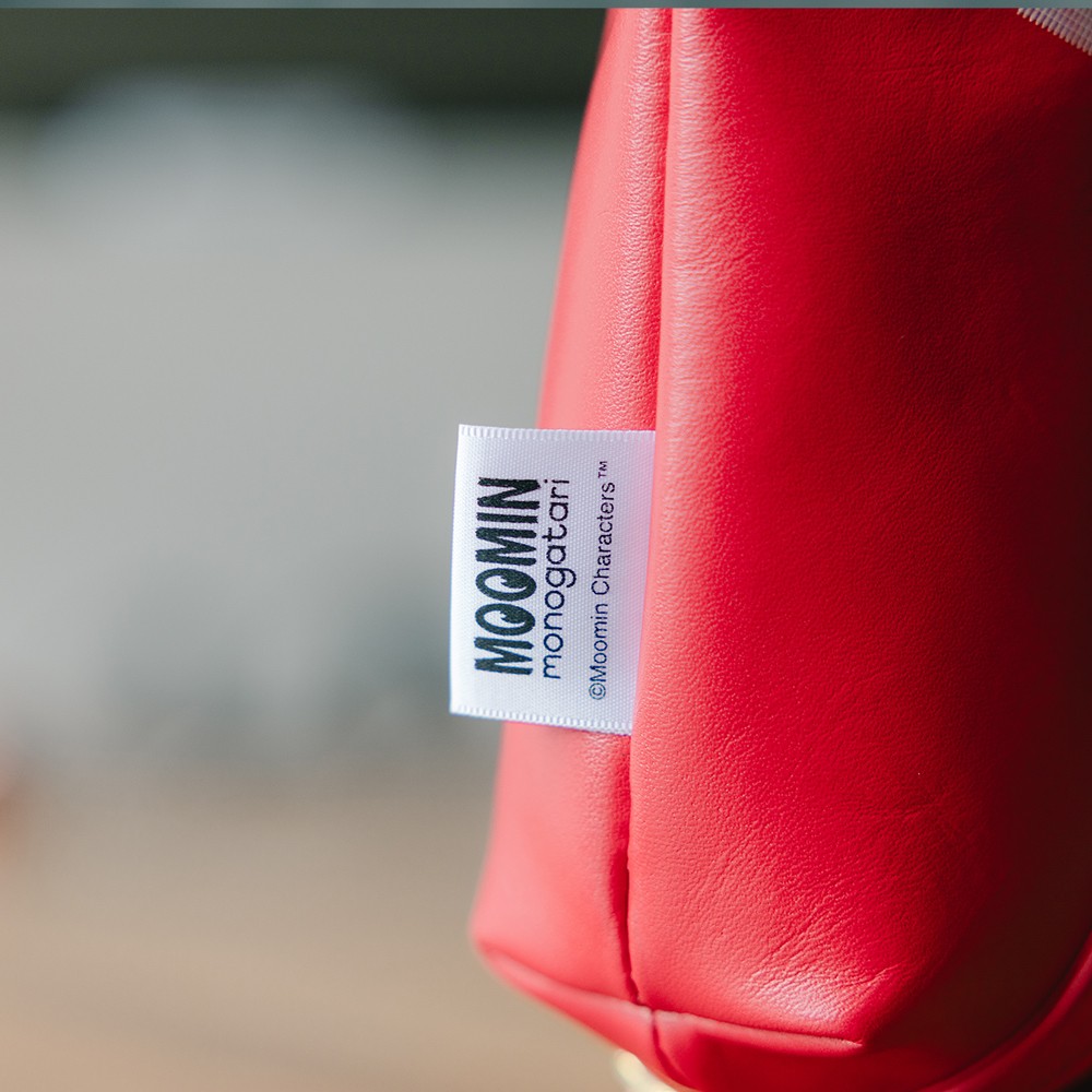 素材には軽くて柔らかな国産レザーを使用し、ボトム部分にはリトルミイのイラストが刺繍されています。