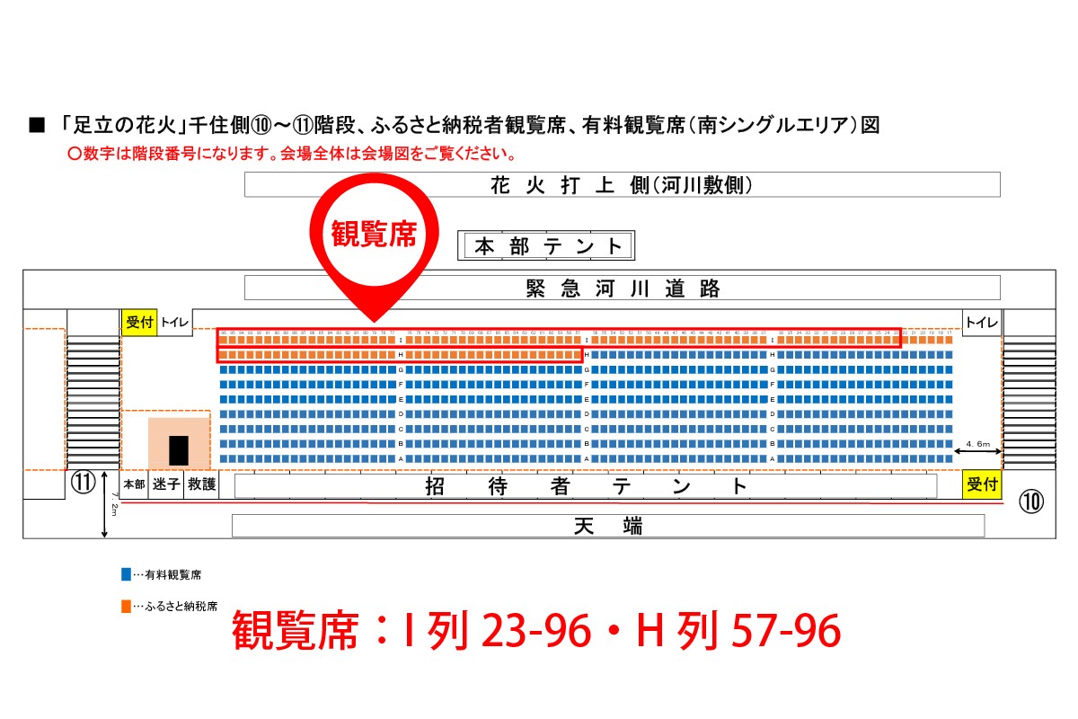 | 容量 | ■席エリア 千住 (打上げポイント)側 南シングルエリア I列23-96・H列57-96 ※荒天時は中止となります (順延なし)。中止の場合、寄附金の返金はありませんが、心ばかりの品物をお送りさせていただきます。 ※お申し込み後のキャンセルは承ることができません。 |