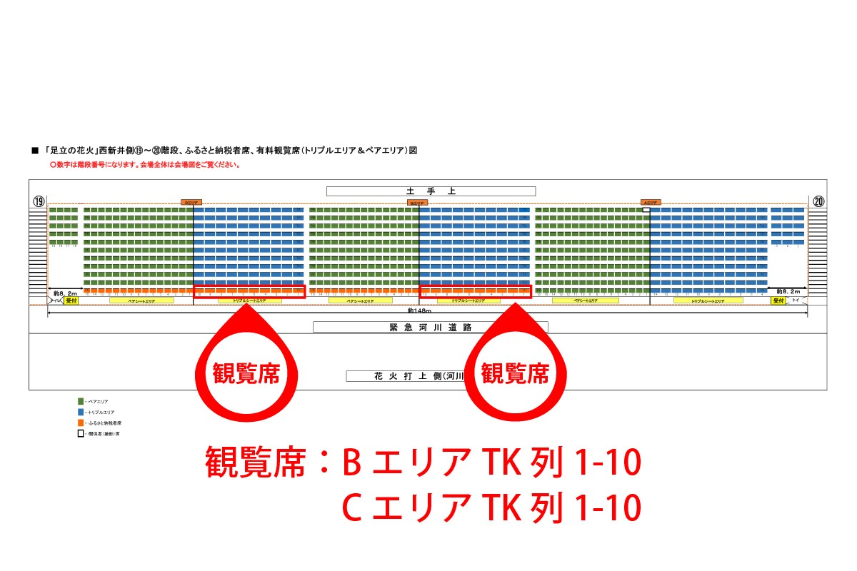 | 容量 | ■席エリア - 西新井 (打上げポイント対岸)側 BエリアTK列1-10 - 西新井 (打上げポイント対岸)側 CエリアTK列1-10 ※荒天時は中止となります (順延なし)。中止の場合、寄附金の返金はありませんが、心ばかりの品物をお送りさせていただきます。 ※お申し込み後のキャンセルは承ることができません。 |