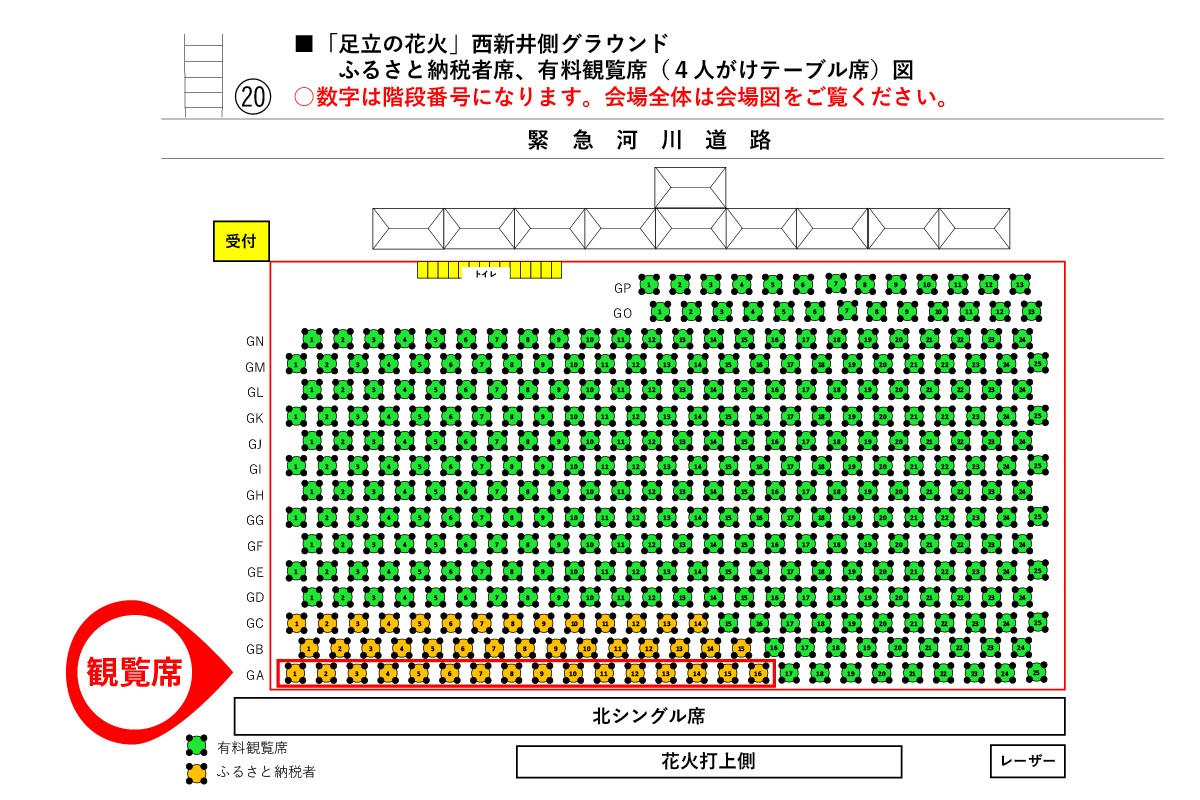 | 容量 | ■席エリア 西新井 (打上げポイント対岸)側 4人がけテーブル席 GA列1-16 ※荒天時は中止となります (順延なし)。中止の場合、寄附金の返金はありませんが、心ばかりの品物をお送りさせていただきます。 ※お申し込み後のキャンセルは承ることができません。 |