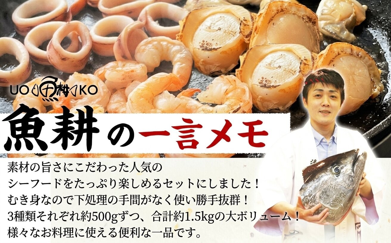 シーフードミックス むき身 3種約1.5kg 帆立 むきエビ いか 海鮮 バーベキュー セット BBQセット 海鮮セット 殻なし