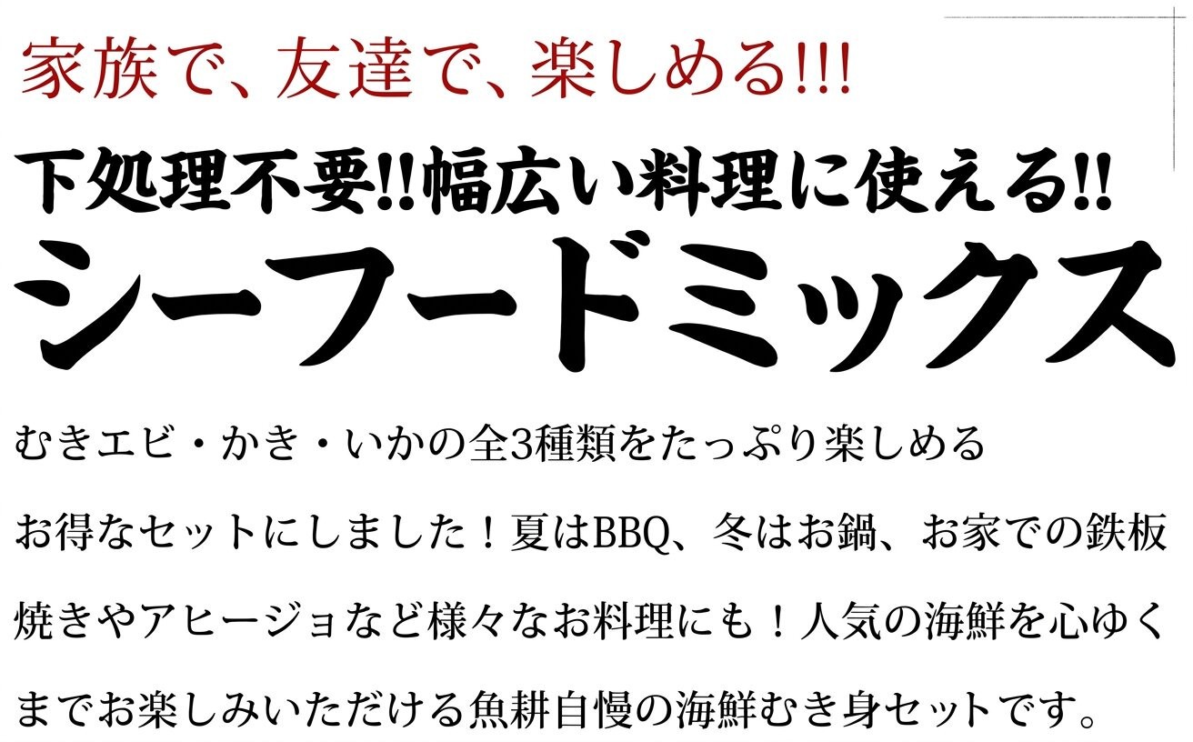 人気の海鮮を心ゆくまでお楽しみいただける魚耕自慢の海鮮むき身セットです。