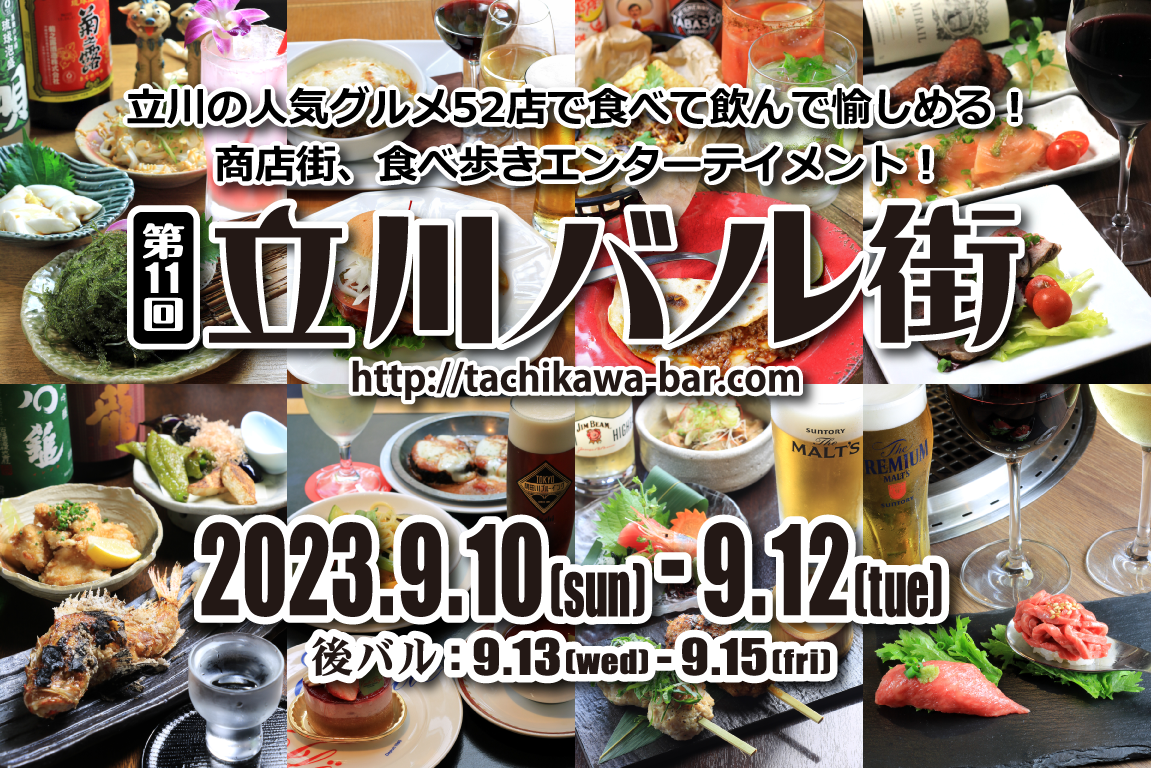 2023年9月10日(日)~2023年9月12日(火)に3日間開催する「立川」で開催する人気グルメ52店舗から気になる4店を食べ飲み歩くイベント! 地元立川の商店街が共同主催しているので安心して参加頂けましす。
