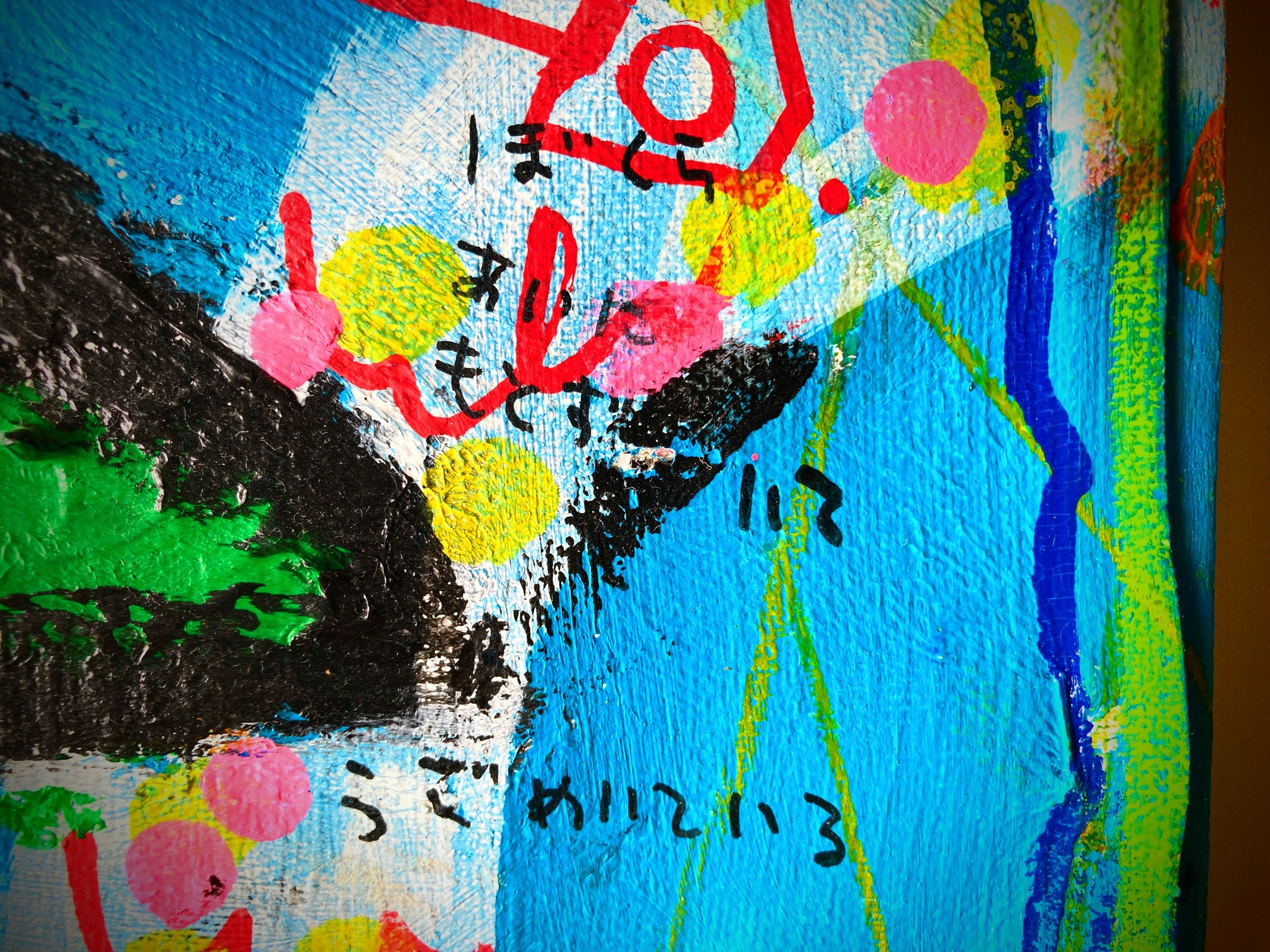 この作品は、キャンバスのはぎれをアトリエにあった木枠に凧糸で括りつけたものにかきました。