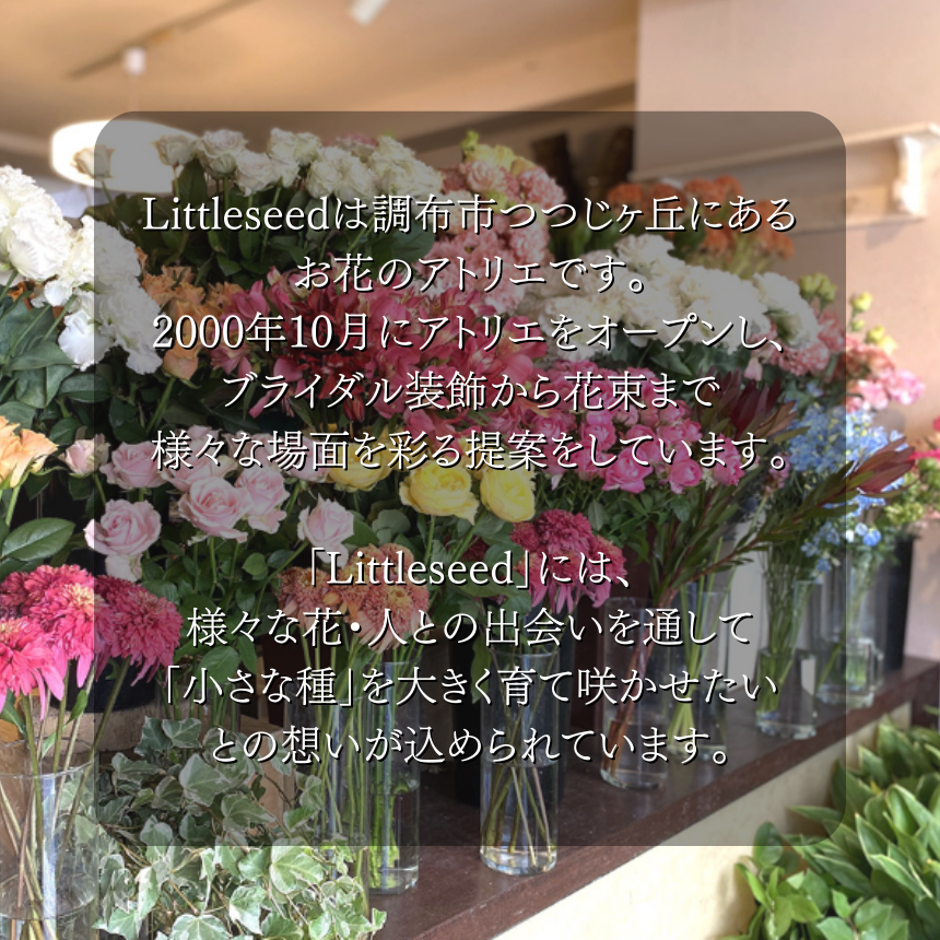 「Littleseed」には、様々な花・人との出会いを通して「小さな種」を大きく育て咲かせたいとの想いが込められています。