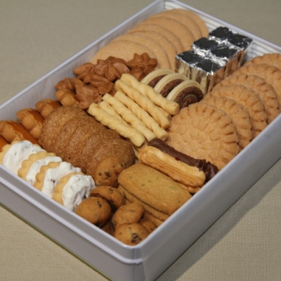 仕切りを使わず缶にぎっしり詰まった、味、食感の異なる12種類のクッキーです。