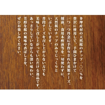 くんせいチーズは燻液、食用木酢液等を一切使わずに、天燃桜のチップのみでじっくりといぶしています。あっさりしていながらも深い味わい、芳醇な桜の風味や香ばしさをぜひお楽しみください。