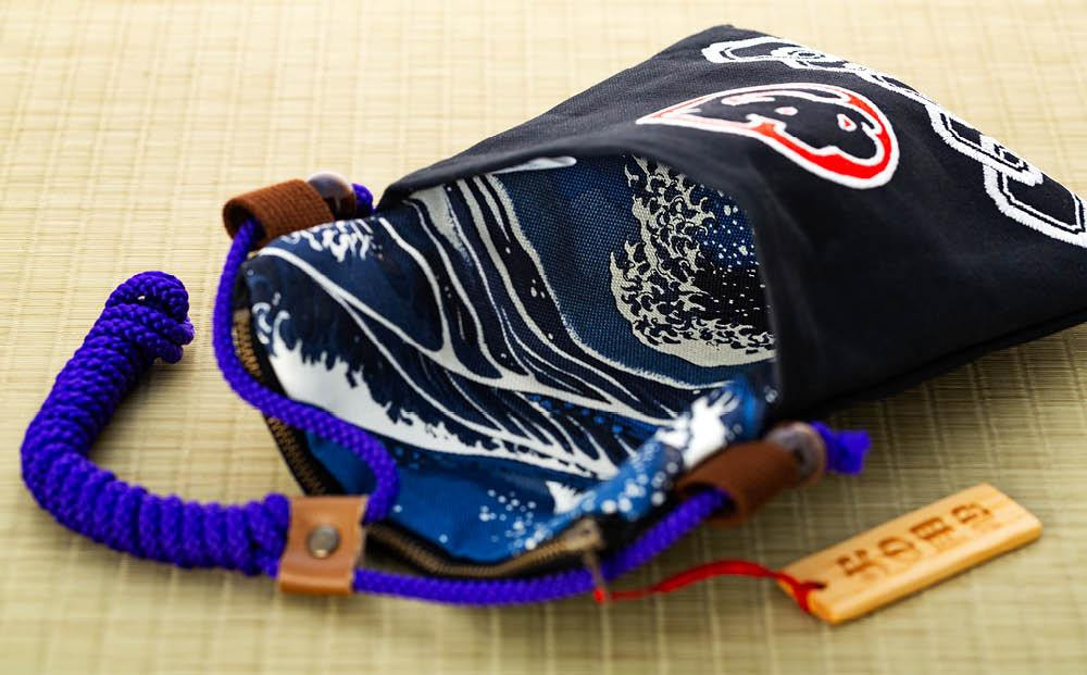 普段着はもちろん甚平や浴衣でも使えるデザインで、スマートフォン、たばこ等を入れるショルダーポーチです。紐は江戸打紐、差し柄は北斎の神奈川沖波裏のプリント生地、中心の文字は、江戸火消しの半被(はっぴ)の染め抜きをモチーフにして、帆布に刺繍を施しています。