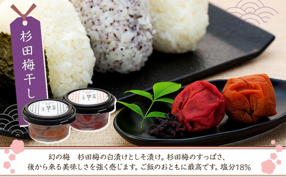 | 容量 | 杉田梅干ししそ漬け:100g 杉田梅干し白漬け:100g 小梅干ししそ漬け:100g 小梅干し白漬け:100g 赤梅酢:330g 白梅酢:330g 梅ドレッシング:200ml 赤しそふりかけ:20g 梅しお:50g 梅ジャム:200g |