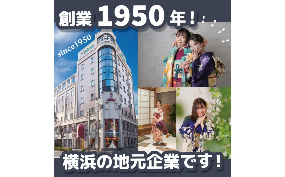 横浜の地で1950年創業のモリノブライズ株式会社。貸衣装、写真撮影を中心に地元のお客様に愛されて来ました。今では親子3代に渡りご利用いただくお客様もいらっしゃいます。そんな横浜の老舗企業がお届けするレンタル振袖は古典柄から流行の最新柄まで幅広くラインナップ。写真撮影は横浜の三渓園や大さん橋をはじめとしたスポットでのロケーション撮影や併設写真スタジオでの撮影が可能です。