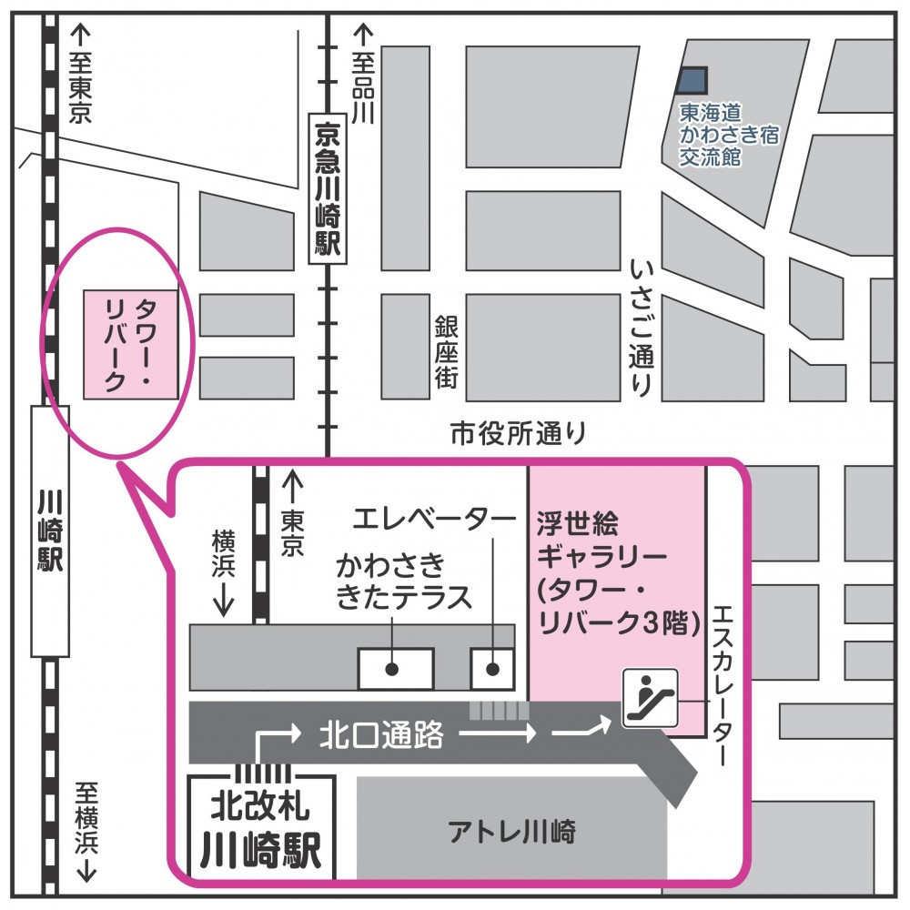 川崎駅北口通路直結の川崎駅前タワー・リバーク内のかわさきアートガーデン内「川崎浮世絵ギャラリー ~斎藤文夫コレクション~」の展示会を年間を通してご覧いただけます。