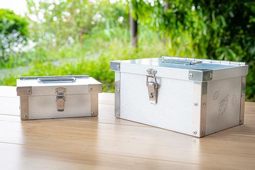 | 容量 | サイズ:W215mm×140mm×140Hmm 板厚:0.6mm 材質: ガルバリウム鋼板(本体) ステンレス(取手・角・蝶番・パチン錠) 重量:1018g |