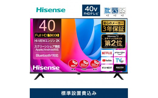 この自治体のポイントについてチョイス公式ポイント交換対象 ますます愛されるブランド、ハイセンス Hisense ハイセンス【設置費込み】40V型 40A4N スマート フルハイビジョン スクリーンシェア ネット動画 YouTube Netflix Alexa ゲームモード AirPlay2 Bluetooth 音声操作対応 液晶 テレビ TV 3年保証 2024年モデル 壁掛け 人気 おすすめ 家電 送料無料