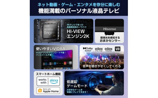 ・HI-VIEWエンジン2K…映像をよりきれいに映し出す高画質エンジン。ネット動画用の高画質処理機能を搭載し、よりコンテンツに適した高画質を実現します。豊富な映像メニューを搭載しスポーツ観戦、ゲーム、PCモニターなど見たいコンテンツに合わせて画質を選択することも可能です。