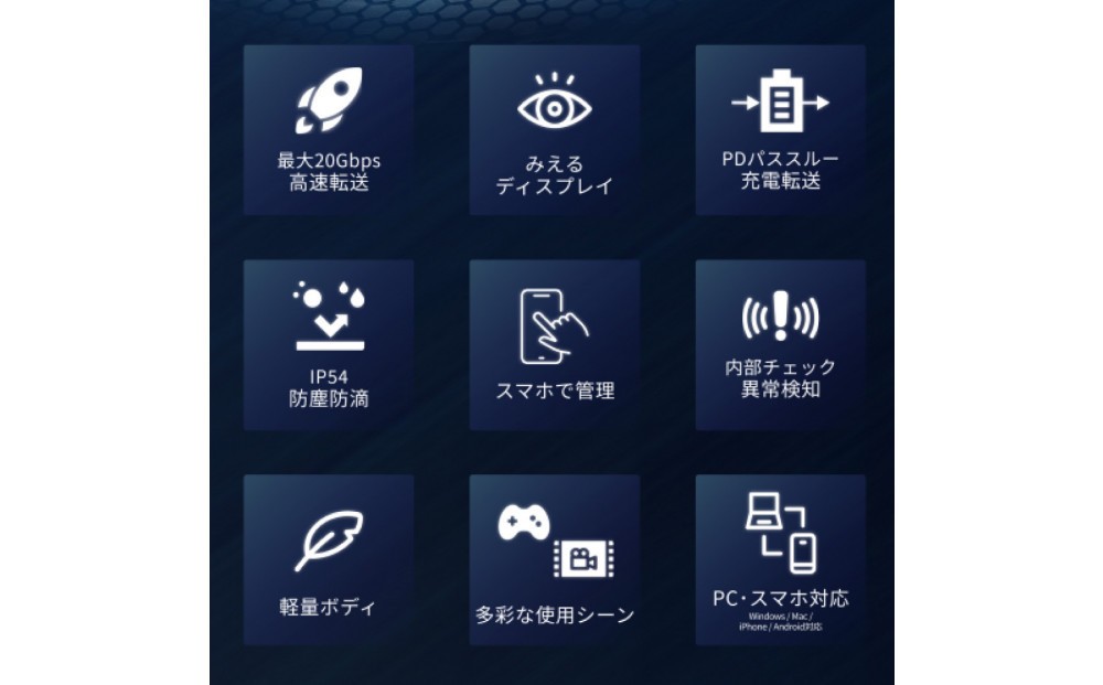 | 容量 | インターフェース:USB 20Gbps(USB3.2 Gen2x2) PD3.0 外形寸法 (W×H×L) 約65 mm×17 mm×99.5 mm 質量 108g 同梱物 USB Type-C PD100W対応ケーブル(約50 cm) |