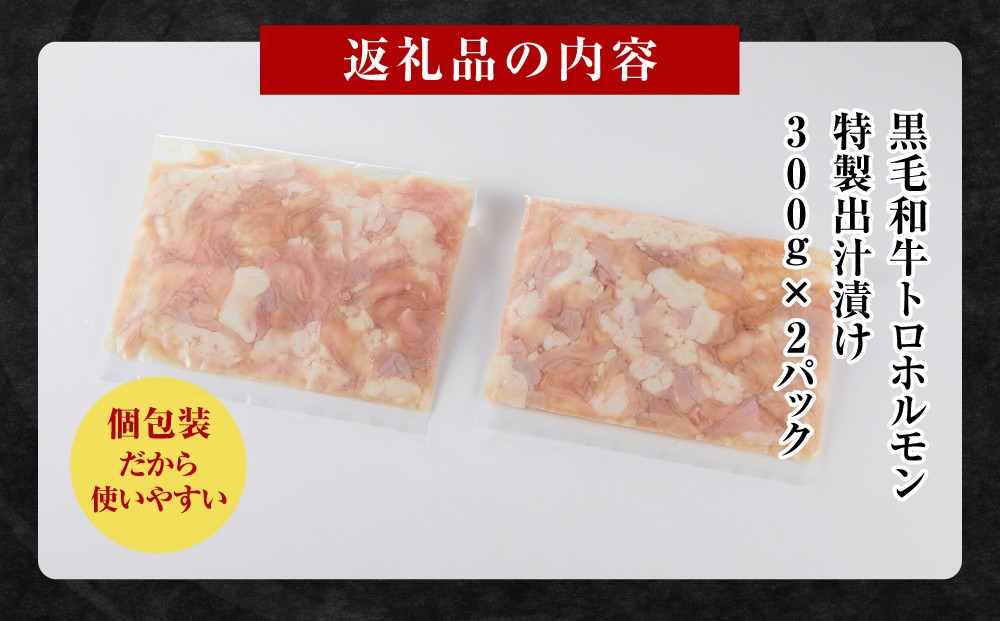 | 容量 | 黒毛和牛トロホルモン 特製出汁漬け(300g×2pc) 【原材料】 牛小腸(国産)、白出汁(食塩、たん白加水分解物、その他)/調味料(アミノ酸等)、酒精、(一部に小麦・牛肉・大豆を含む) |