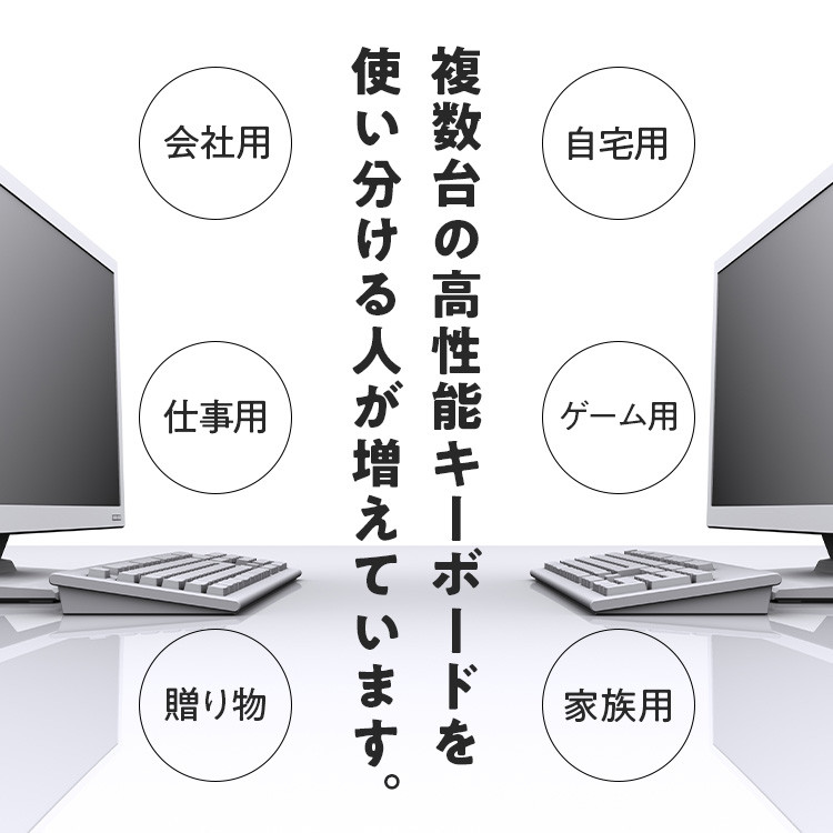 長時間のタイピングでも指が疲れにくい静電容量無接点スイッチを採用し、押し心地が滑らかで耐久性に優れています。