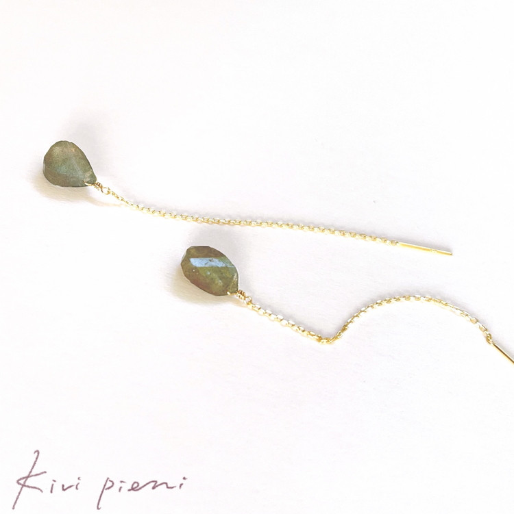 4面にツイストされたフォルムから美しい輝きを放つブリオレットカットのマダガスカル産ラブラドライトをアメリカンピアスに仕立てました。
