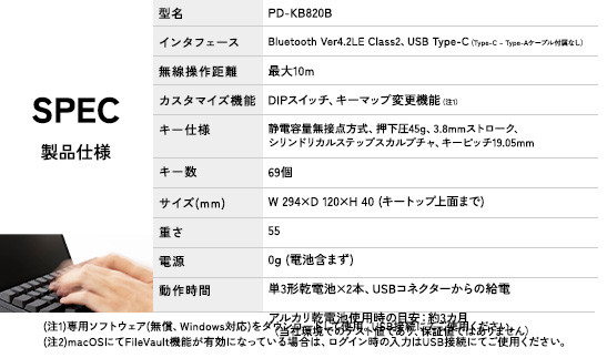 高速入力に最適なチャタリングのない静電容量無接点方式、長時間の使用でも疲れない理想的なキータッチと長寿命、Bluetooth接続とUSB接続(Type-C)に対応するマルチプラットフォーム設計。